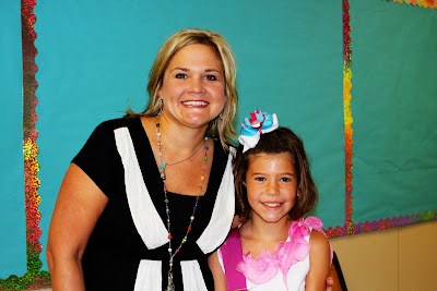 Today was Katie's first day of third grade. I seriously can not believe that she is in the third grade already. Her teacher this year is Mrs. Honderich and she is the best teacher! Katie also has a great class and knows alot of her classmates already. This year's first day outfit came from a little boutique in East Texas. I went shopping with my friends and saw it and thought of Katie right away. I think the outfit is very "Sharpay" from High School Musical. Here are some pictures from this morning.